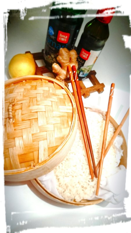 3°) Le lendemain l’égoutter au dessus d’une casserole ayant un diamètre à peine inférieur à celui du panier en bambou à l’aide d’un chinois ou d’une passoire ( afin de ne pas gâcher inutilement l’eau de trempage puisqu’on ne la boira pas, elle servira seulement à cuire le riz à la vapeur).