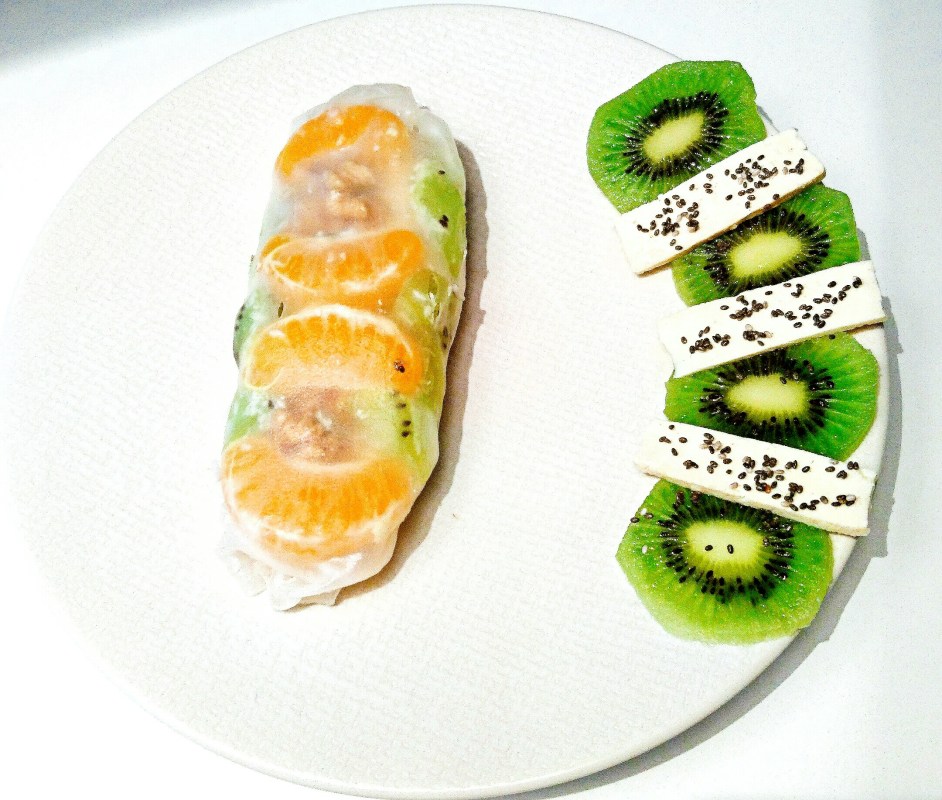 Disposez-y les quartiers de clémentine, les deux noix, le tofu puis le kiwi et enfin les vermicelles de riz. Rabattez les deux extrémités puis roulez.