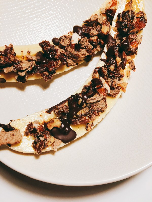 Ouvrez la banane en deux, faîtes fondre 1 carré de chocolat dans la casserole à feu doux en remuant pour ne pas qu’il attache, versez-le sur la banane puis sortez le plat du four et saupoudrez la banane de votre préparation croustillante.