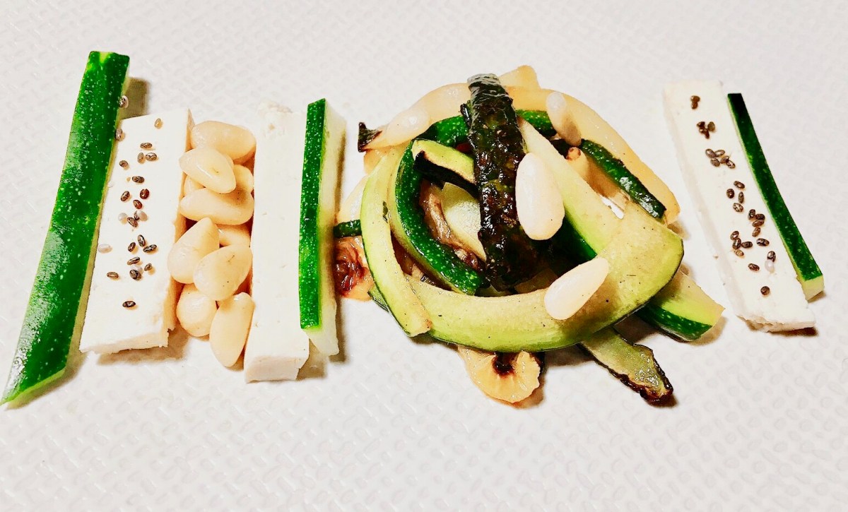 Pendant ce temps-là, découpez le tofu, mettez-le dans l’assiette, versez quelques pignons et saupoudrez de graines de chia.