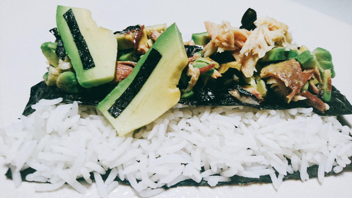 Placez maintenant la feuille d’algue dans votre assiette, ajoutez-y le riz puis les morceaux de maquereaux, d’avocat et d’algue. Ajoutez quelques gouttes de citron jaune et savourez votre maki destructuré!
