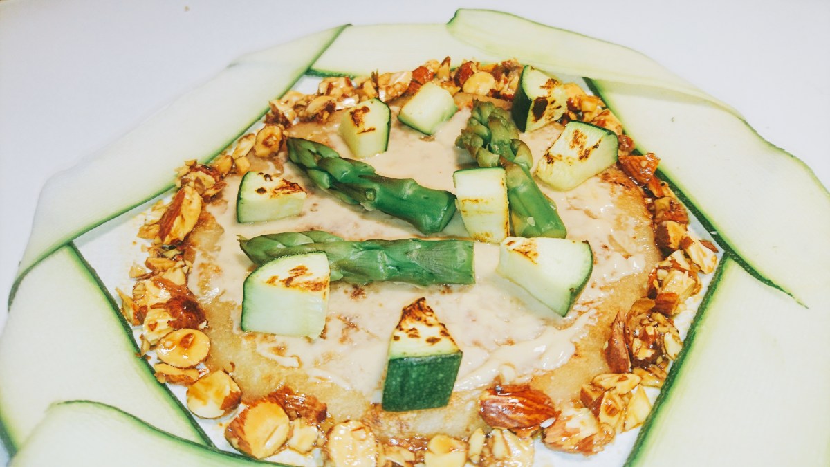 Tartinez une petite cuillère à café de purée d’amandes blanches sur la pâte. Déposez ensuite les cubes de courgette dorés à la poêle, l’asperge ( que vous également faire revenir à la poêle) et concassez quelques amandes que vous jetterez dans la poêle éteinte mais encore chaude. Versez le sirop d’érable et la sauce tamari, remuez bien ( il faut que les amandes caramélisent mais ne grillent pas). Disposez maintenant tous vos éléments dans l’assiette et savourez.