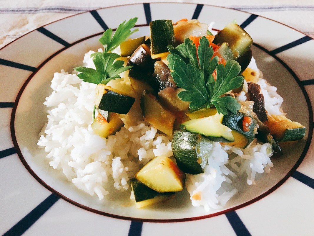 À la poêle, commencez par faire cuire les aubergines- coupées en cubes- en ajoutant un gros filet d’huile d’olive, tournez de temps en temps avec une spatule en bois. Une fois cuites et grillées, c’est au tour des des courgettes, puis des tomates. Salez, poivrez, c’est prêt!