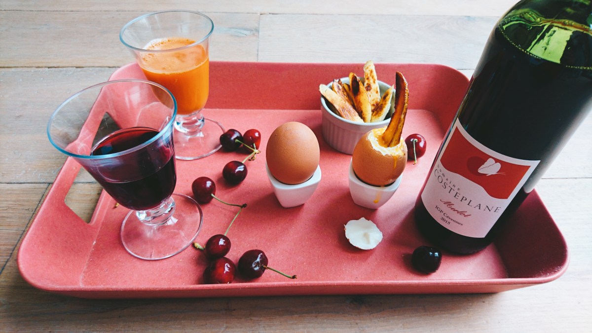 Oeufs à la coque, jus de carottes à l’extracteur, quelques pommes de terre en frites, un verre de vin rouge naturel et de jolies cerises.