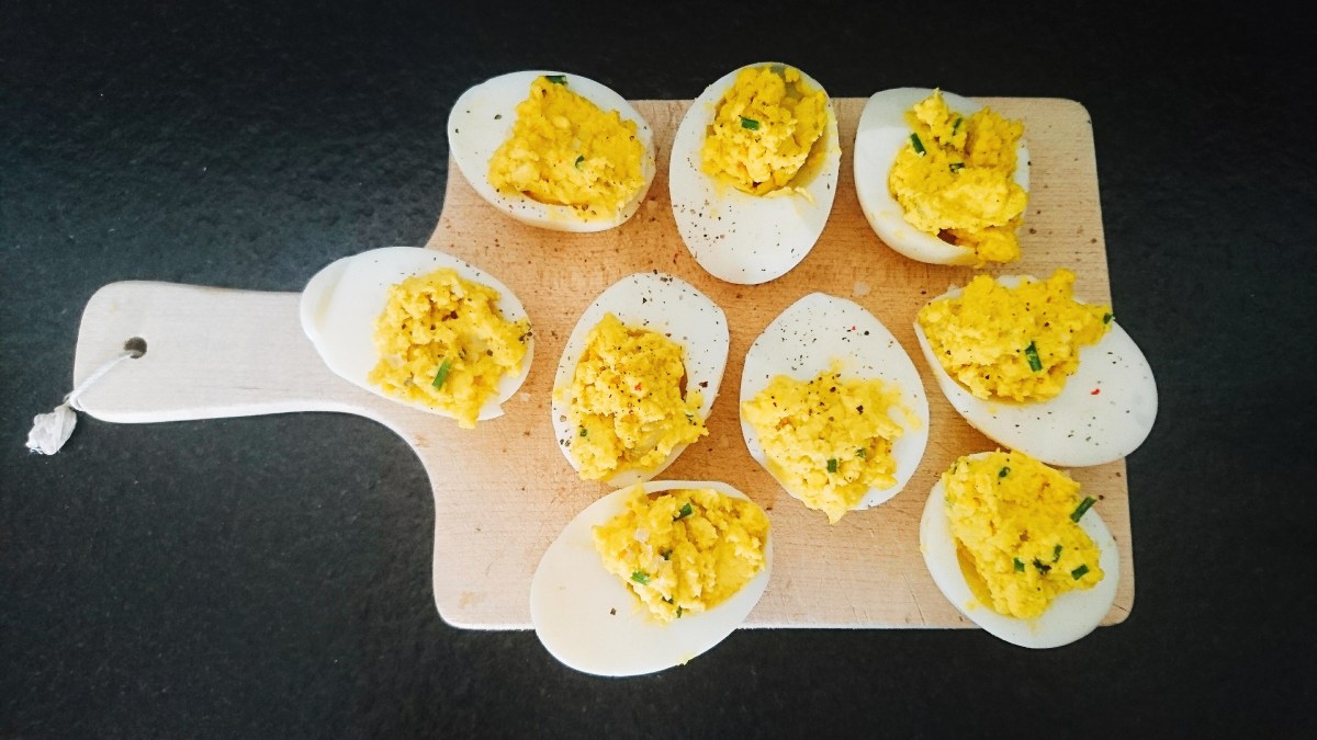 Ecaillez-les, coupez-les en deux et récupérez tous les jaunes. Ecrasez-les à la fourchette en y incorporant l’huile d’olive, la ciboulette, la moutarde ou le citron, le sel et le poivre. Mélangez bien, puis remplissez les blancs d’oeufs.
