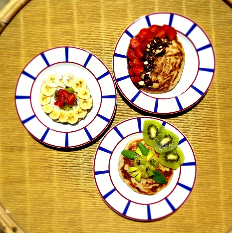 Ensuite lavez le mixeur et incorporez-y les ingrédients nécessaires à la réalisation de la pâte à pancakes. Versez un trait d’huile de coco dans la poêle, chauffez à feu moyen et versez des petits ronds de pancakes. Faites cuire des deux côtés. Garnissez. C’est prêt! 🙂