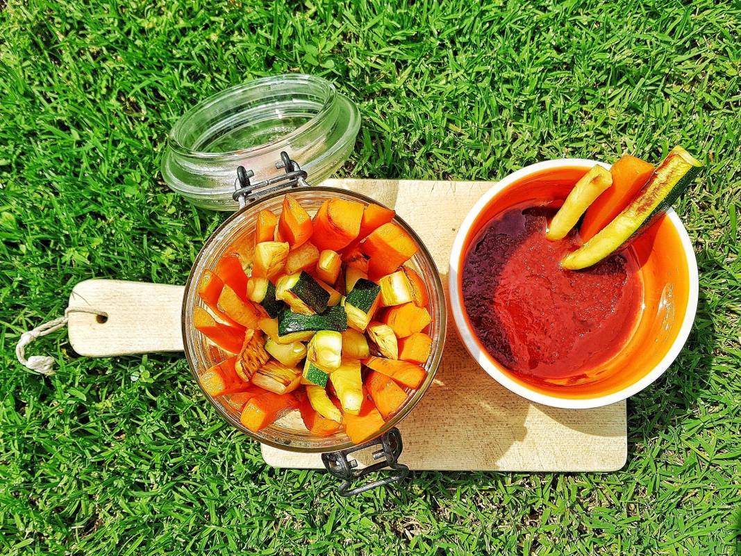 Je vous ai concocté des légumes grillés al dente à tremper dans une sauce tomate, olive et tamari.