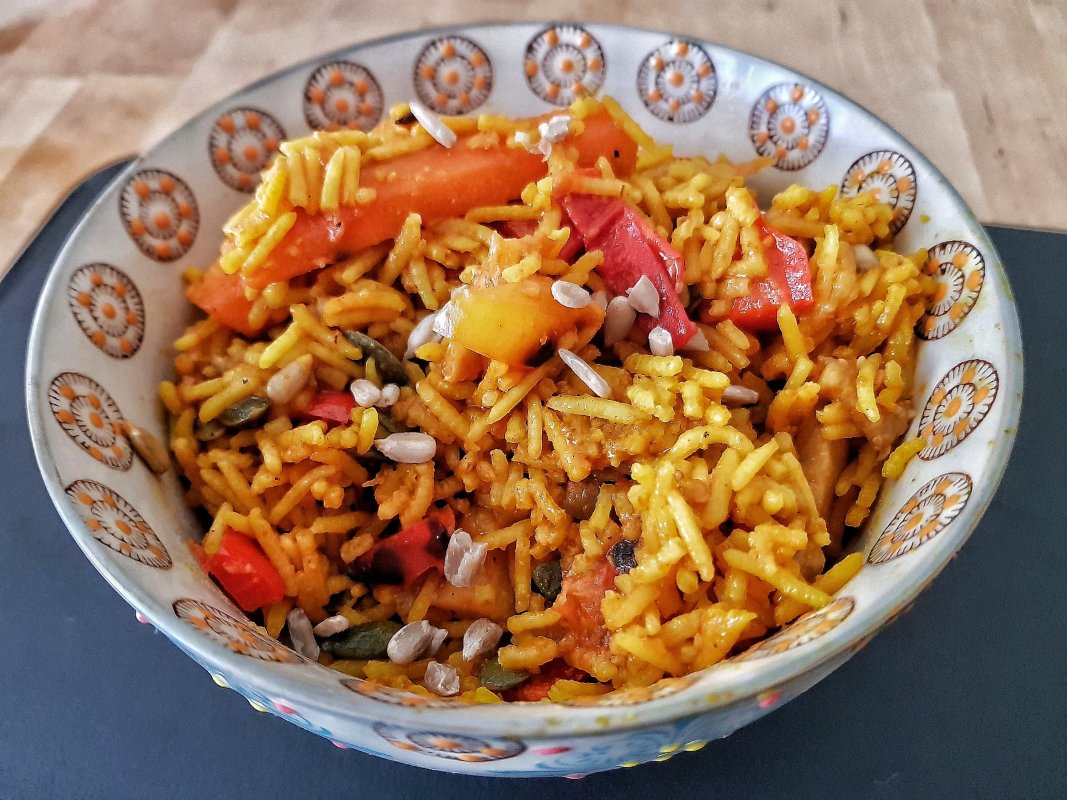 Faites ensuite revenir les morceaux de carottes et céleri à la poêle dans de l’huile de coco. Ajoutez ensuite le reste de légumes. Mélangez avec le riz. Ajoutez les graines, le sel et le sirop d’érable. Savourez!:)