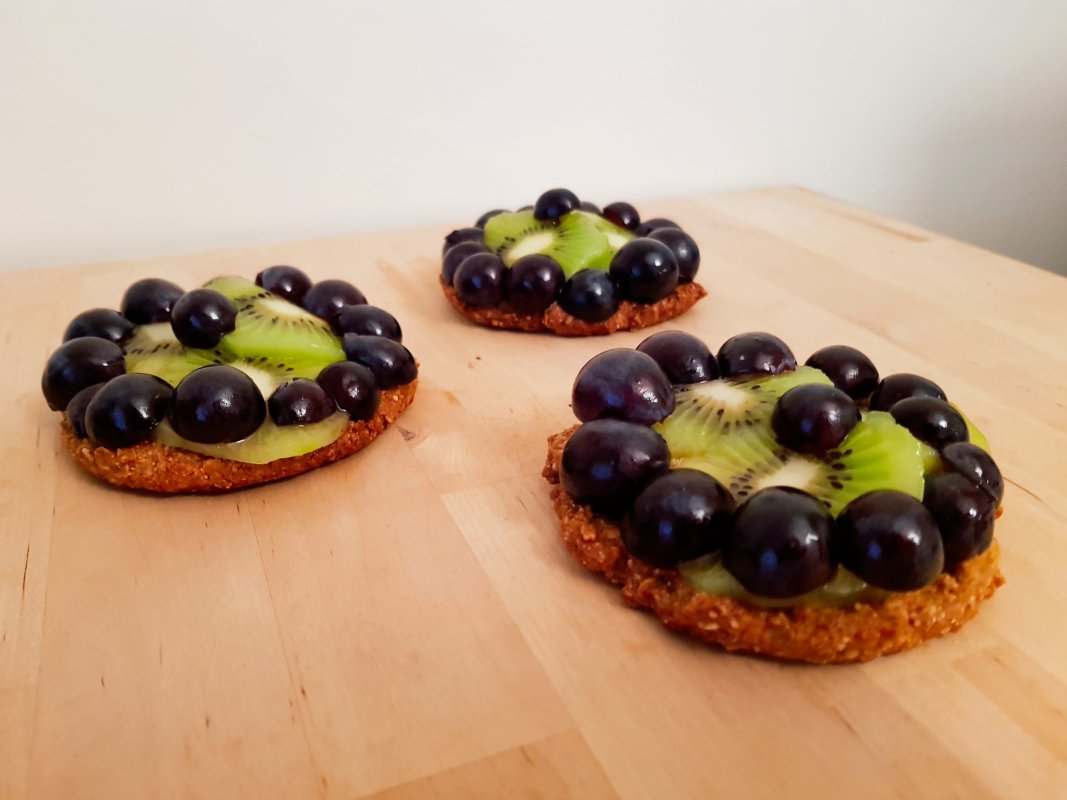Mélangez les ingrédients à la fourchette exceptés les fruits puis étalez 3 cercles sur du papier cuisson et enfournez pour environ 10 minutes ( jusqu’à ce que la pâte dore.)