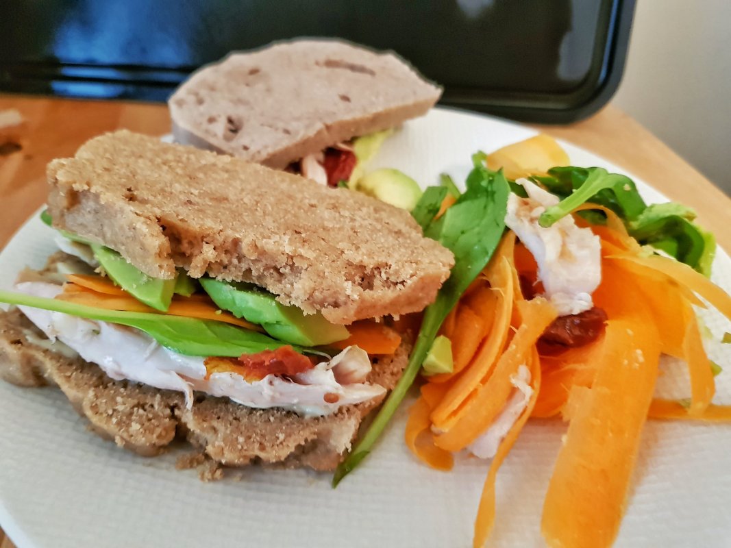 Quant à la garniture, ils sont ici remplis de blancs de poulet rôti, d’avocat, de tagliatelles de carottes, de tomates séchées, de pousses d’épinard et d’un soupçon de mayonnaise;)