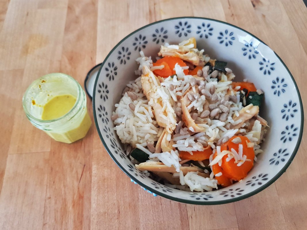Il ne vous restera plus qu’à mélanger le tout sans oublier la petite sauce au lait de coco. Pour bien diluer les épices déposez un verre sur le tamis du vitaliseur avec le lait de coco et les épices le temps que le lait chauffe légèrement. Versez sur votre plat, ajoutez quelques graines de tournesol par exemple et mélangez.