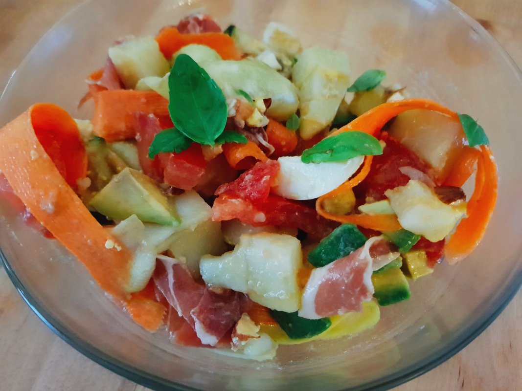 Pendant ce temps-là lavez vos légumes puis pelez-les en taligatelles. Lavez le basilic et déposez le tout dans un saladier.