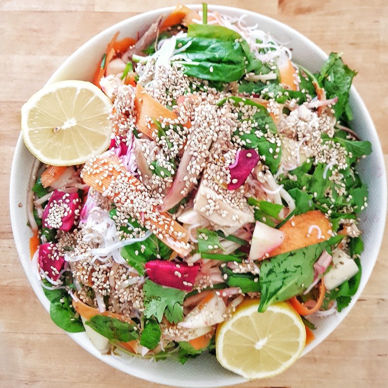 Ajoutez le poulet et les vermicelles de riz sans oublier de verser la sauce et les graines de sésame! Savourez!
