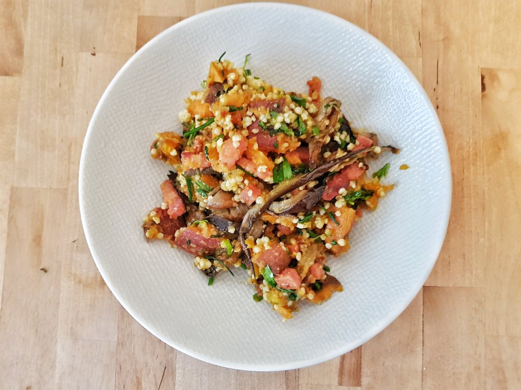 Préchauffez le four à 180 degrés et déposez des dés de patates douces et des rondelles de carottes sur la plaque, versez un trait d’huile d’olive et enfournez pour au moins 20 minutes ( en fonction de la taille des dés). Faites ensuite de même avec l’aubergine coupée en fines lamelles.