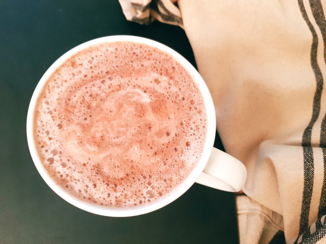 Faites bouillir l’eau et versez dans le blender avec le chocolat en poudre et la purée d’amandes.