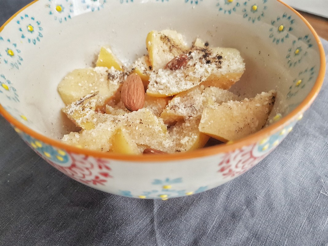 Découpez le coing en gros dés et déposez-les dans le saladier. Couvrez d’eau. Cuisez 15 minutes environ.