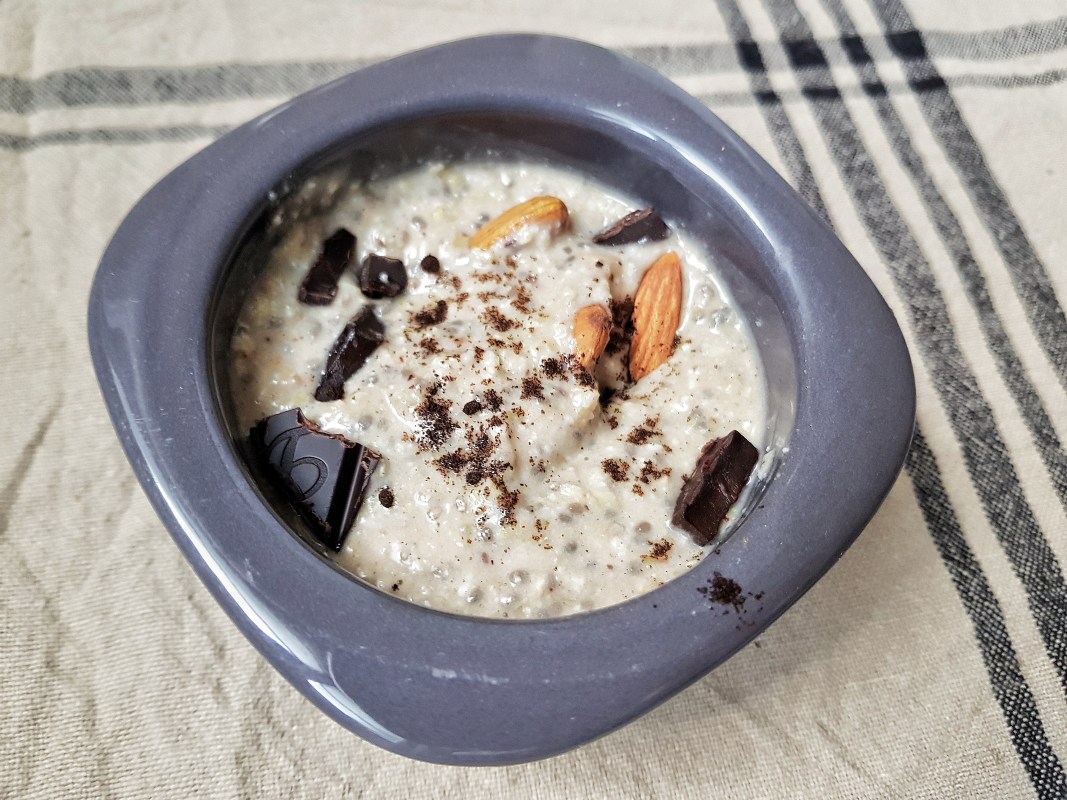 Passez la banane, l’eau et la purée d’amandes blanches au blender ( sur le mode smoothie si vous avez c’est encore mieux!)