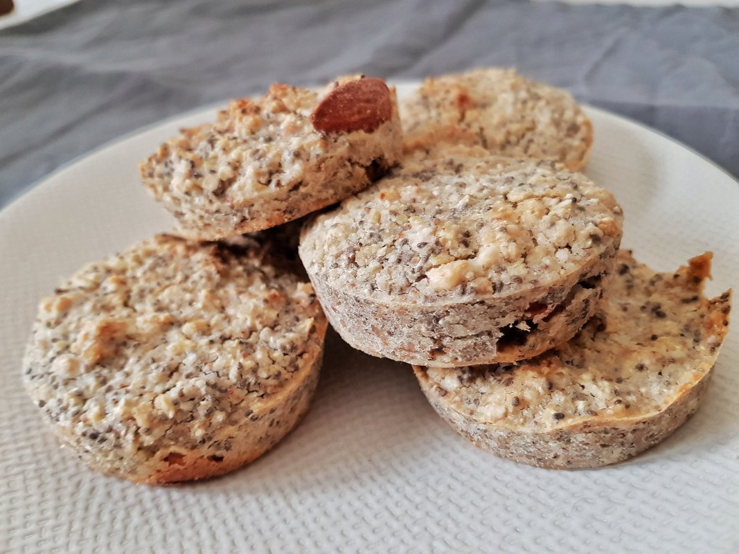 Préchauffez le four à 180 degrés, versez les graines de chia dans le verre d’eau. Mélangez le reste des ingrédients, ajoutez en dernier l’eau et les graines de chia. Versez dans les moules et enfournez pour 25/30 minutes à 180 degrés.
