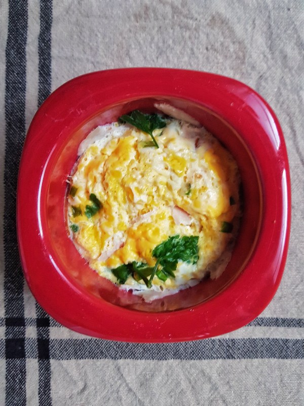 Déposez la ciboulette et les morceaux de jambon de dinde dans un ramequin, ajoutez l’oeuf, mélangez et cuisez au vitaliseur environ 10 minutes.