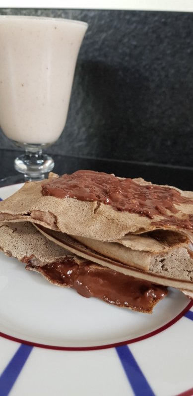 Faites fondre le chocolat noir, ajoutez les purées d’amandes et noisettes, incorporez les amandes et les noisettes concassées au blender, mélangez bien et vous n’aurez plus qu’à tartiner votre galette, à la rouler et à la savourer !