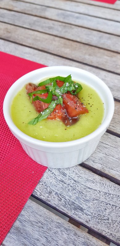 Réservez environ 3h au réfrigérateur avant de servir avec une pincée de sel, de poivre, quelques dés de tomates et quelques feuilles de basilic ciselée.