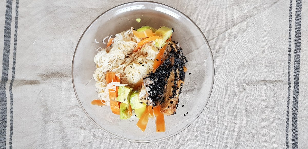 Durant leur temps de cuisson vous aurez lavé et épluché la carotte et vous en aurez fait des tagliatelles à l’aide de l’économe. Vous aurez ajouté l’avocat en dés, le maquereau, le sésame, la sauce tamari et le citron.