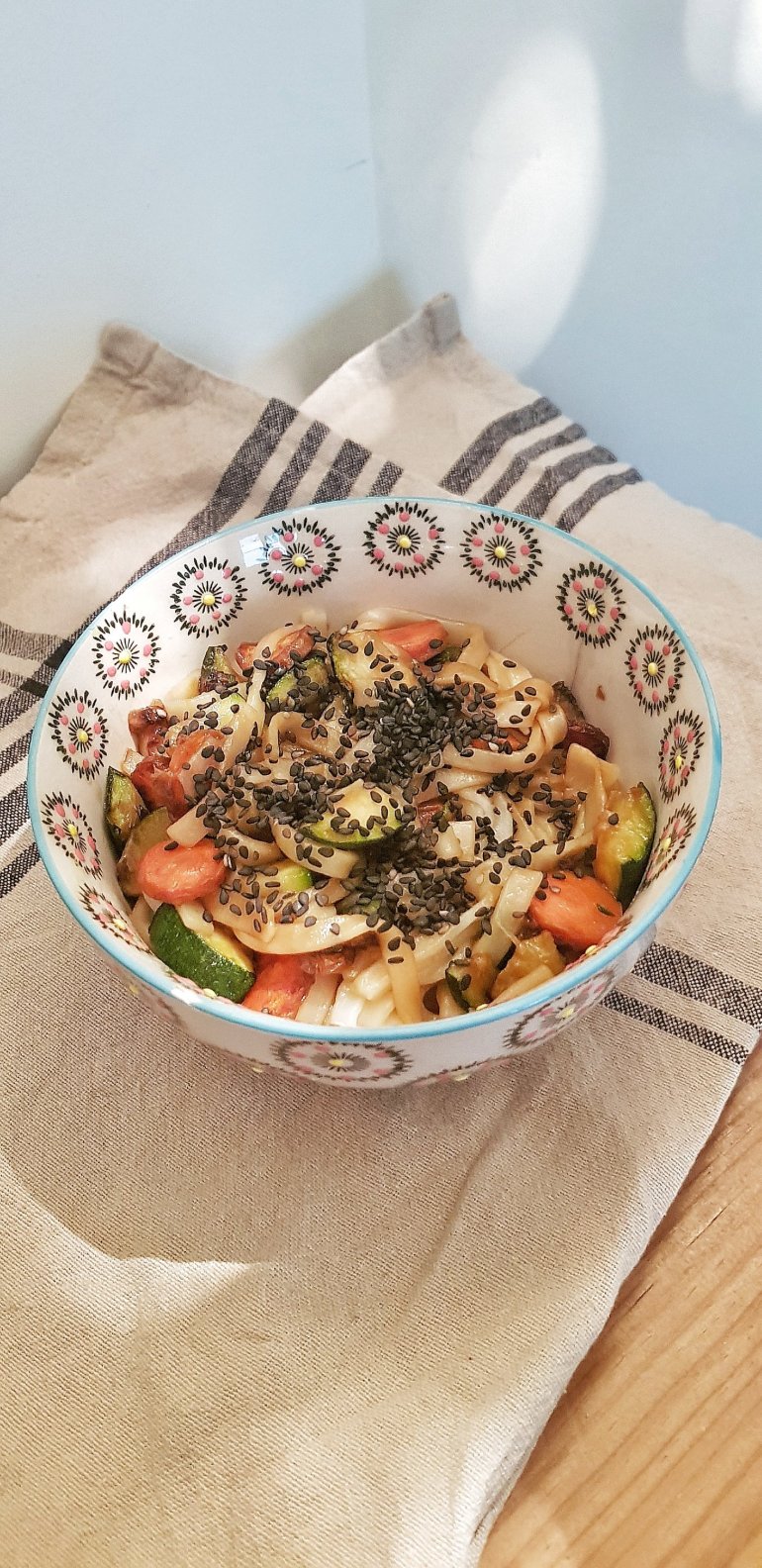 Remplissez la casserole d’eau bouillante et versez les pâtes qui cuiront 10 minutes ( vérifiez sur votre paquet). Égouttez et incorporez-les au mélange de légumes. Versez la sauce tamari sur le tout, mélangez bien et servez.