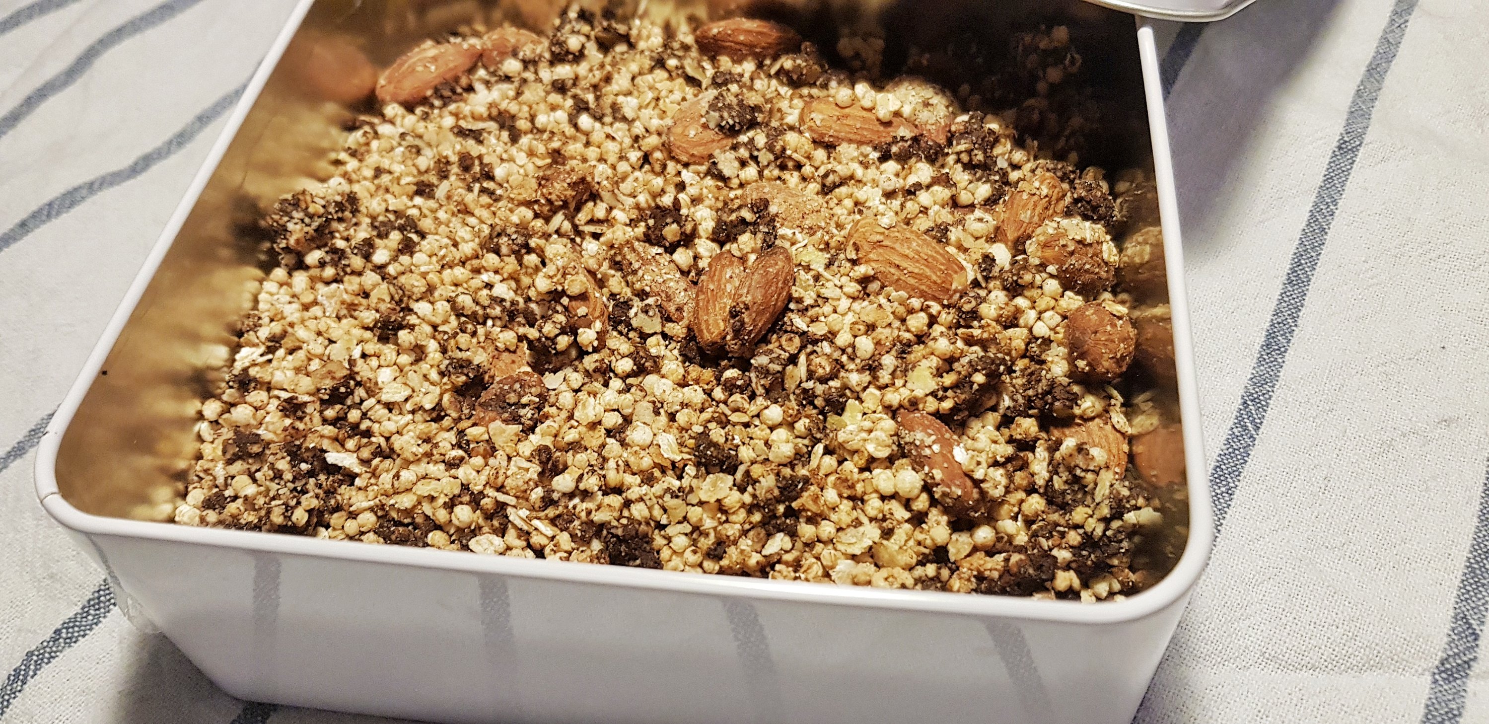 Dans un plat allant au four versez les flocons de sarrasin et le quinoa soufflé pour bien tapisser le fond du plat mais attention à ne pas avoir un mélange trop épais afin de cuire le granola plus rapidement sans avoir à le retourner en milieu de cuisson.