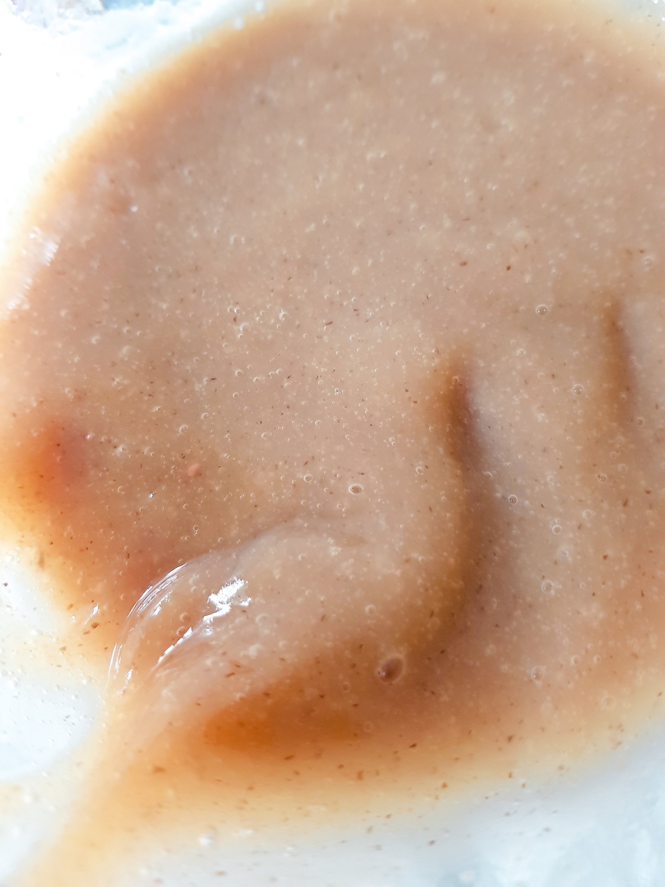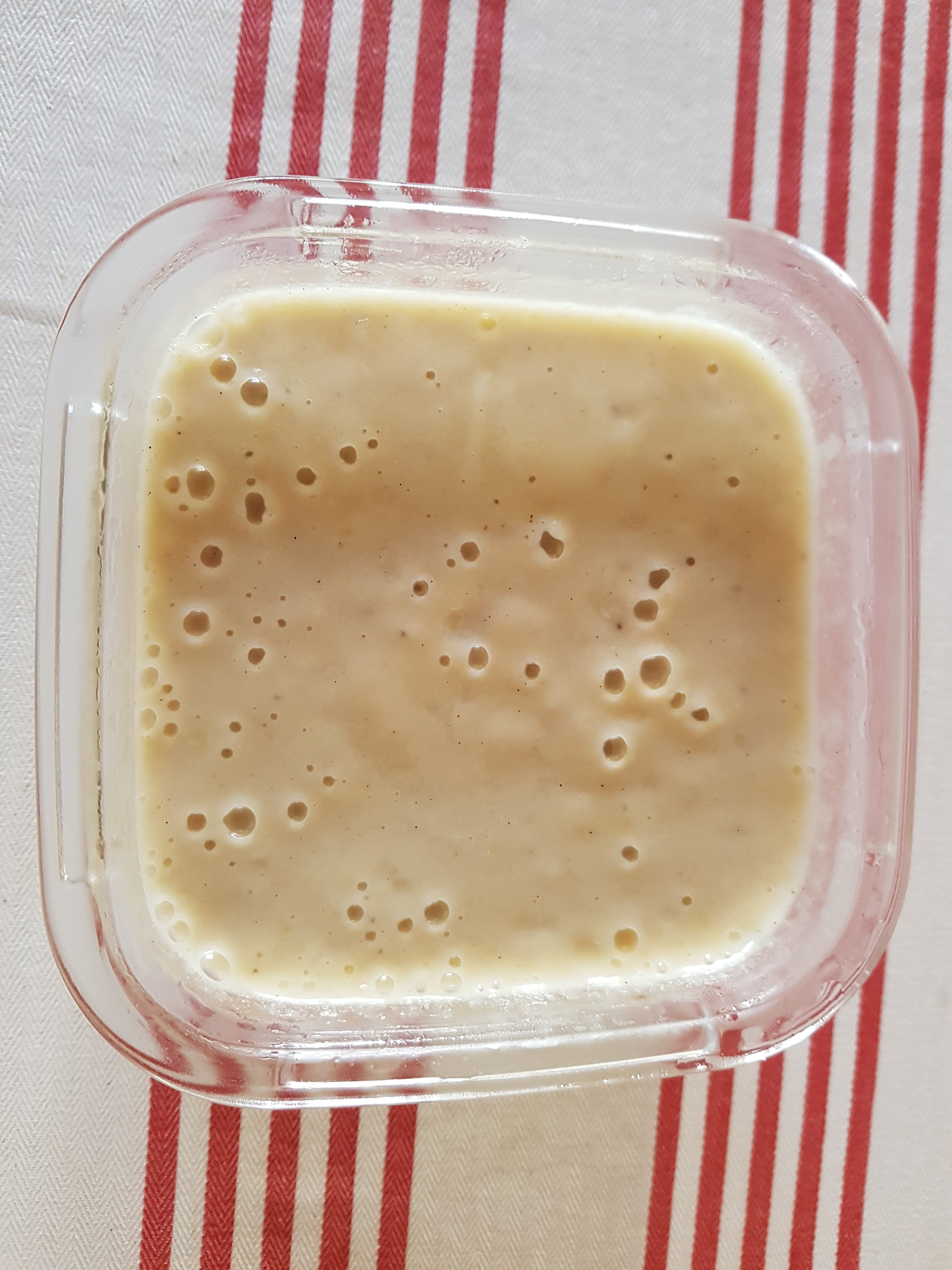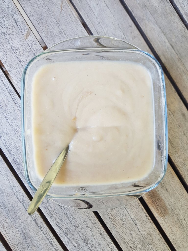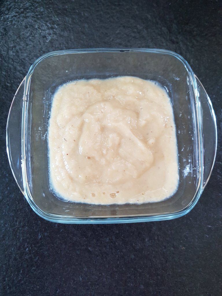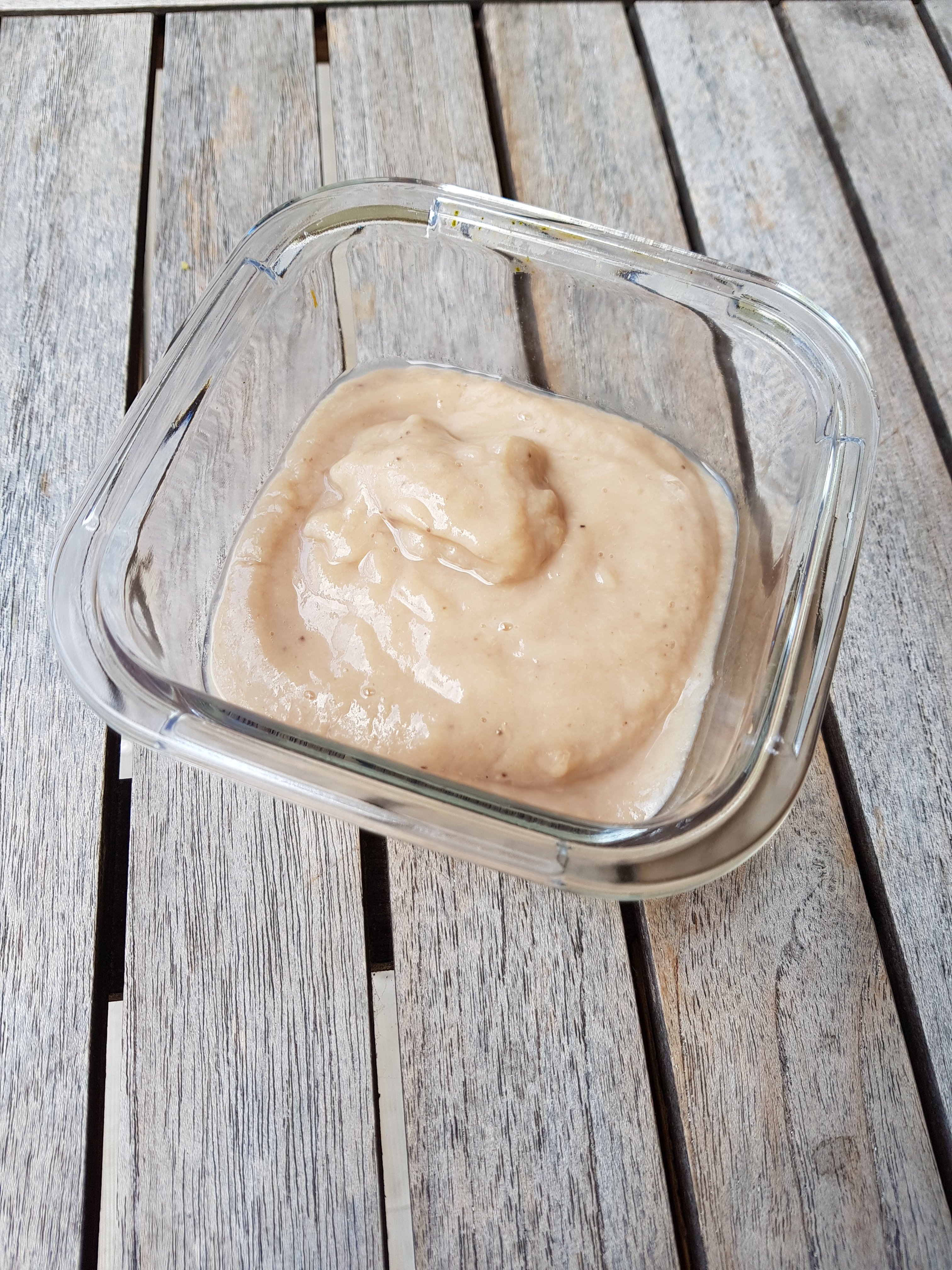 1 pomme et 1 banane cuites au vitaliseur mixées au blender avec une cuillère à café de purée d’amandes blanches.