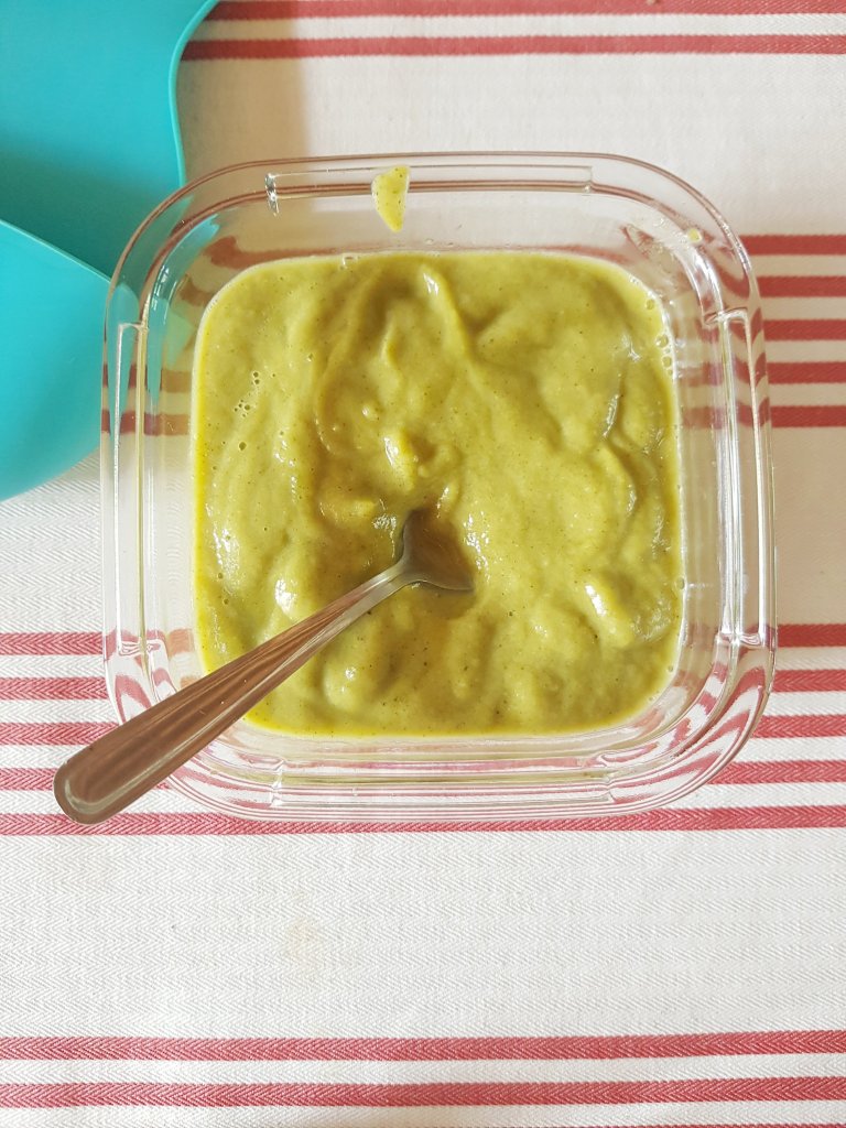 Quelques morceaux de brocolis, rondelles de pommes de terre et courgettes cuits au vitaliseur et mixés.