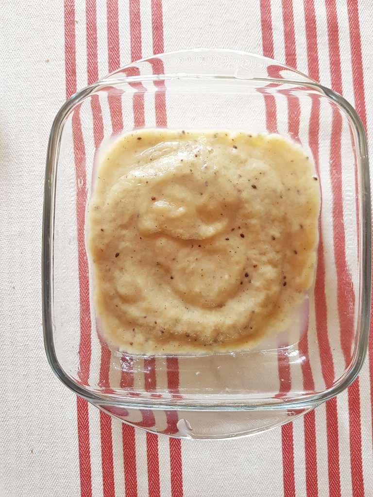 Pommes de terre et poivrons cuits au vitaliseur et mixés avec un petit morceau de filet de maquereau ( en boite, nature) et un peu d’eau ( en fonction de la consistance que vous souhaitez donner).