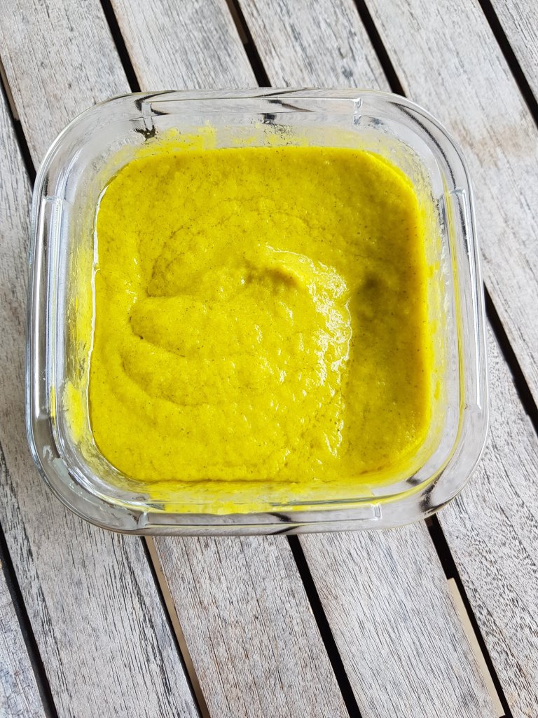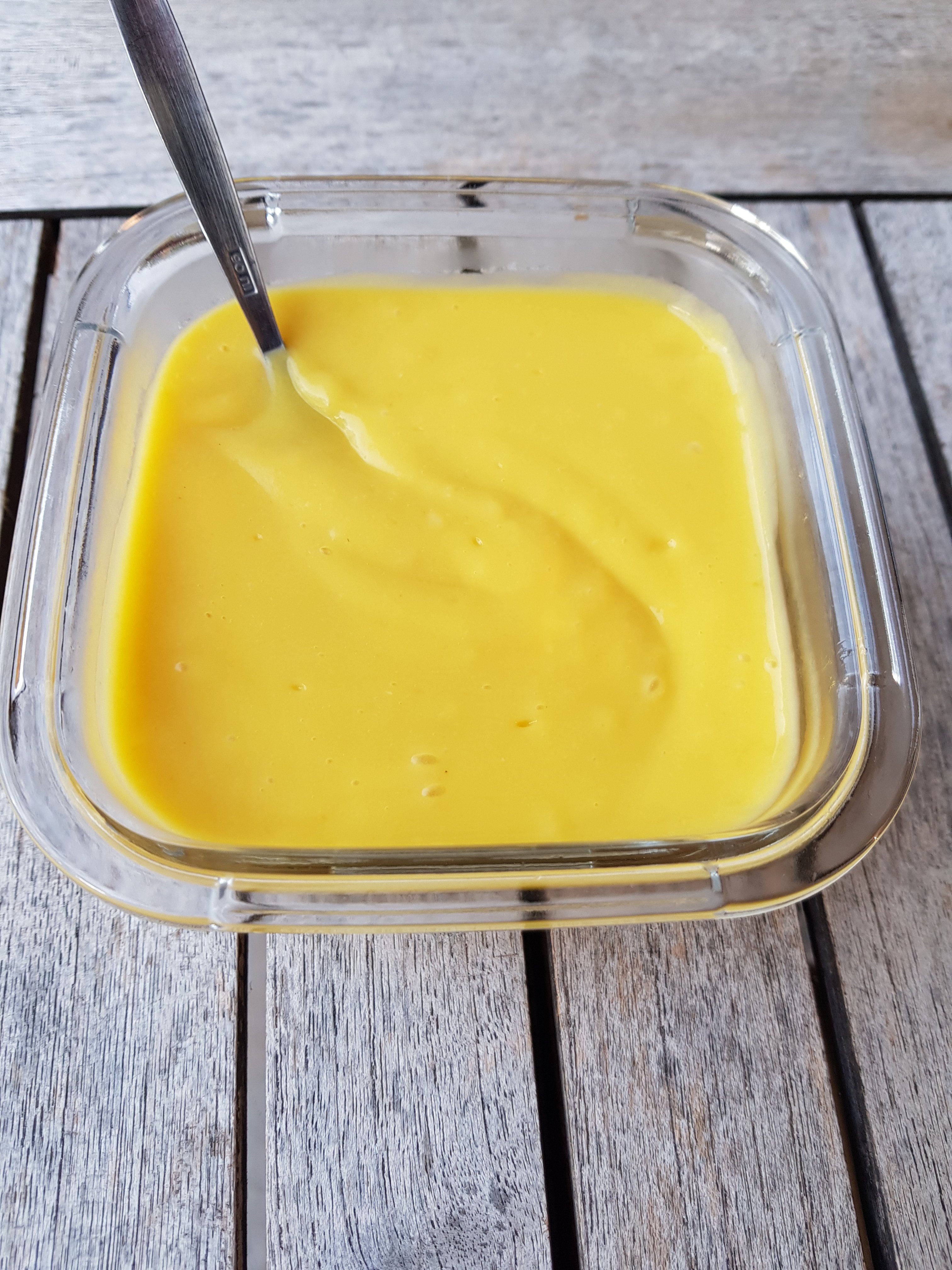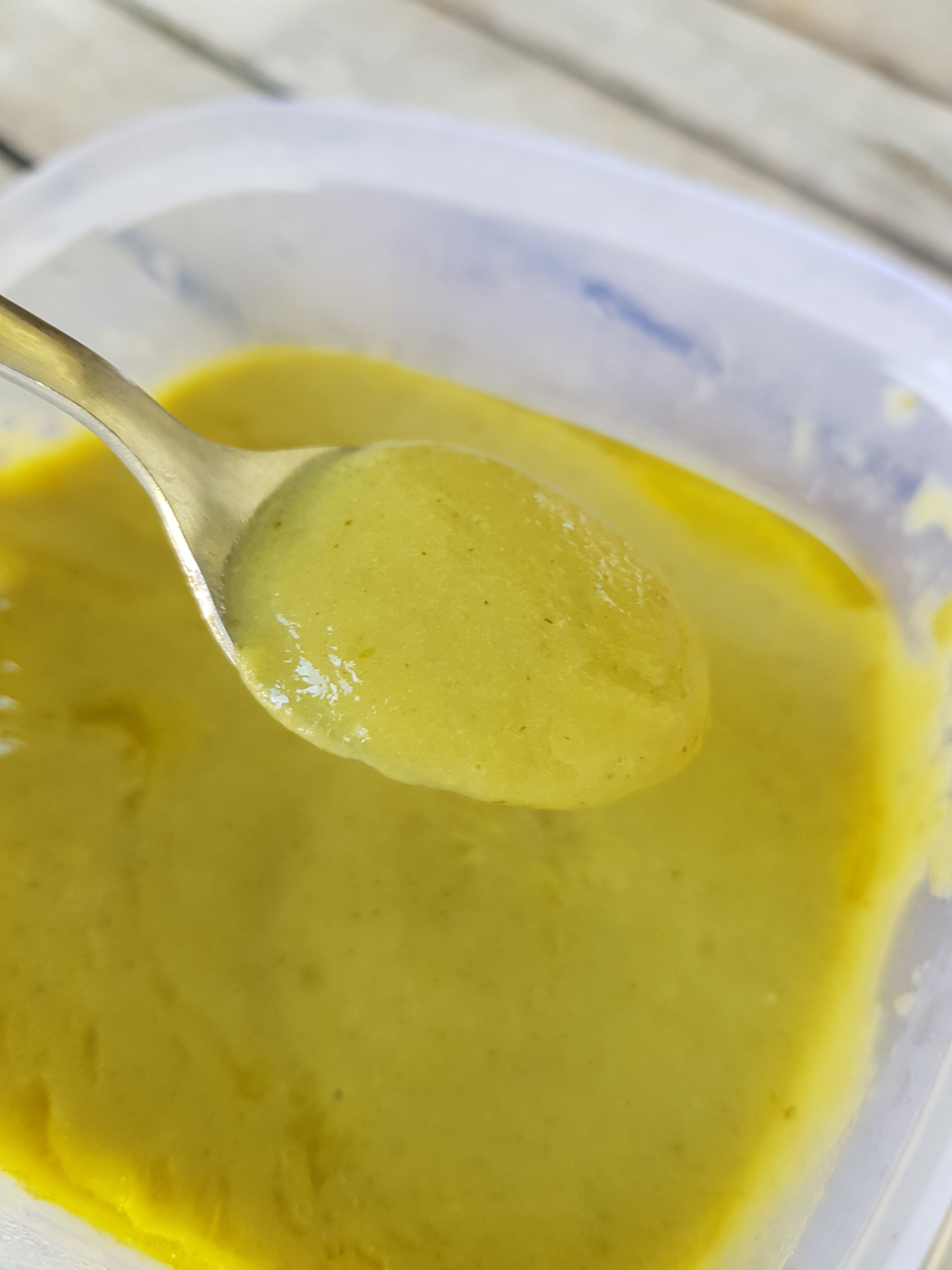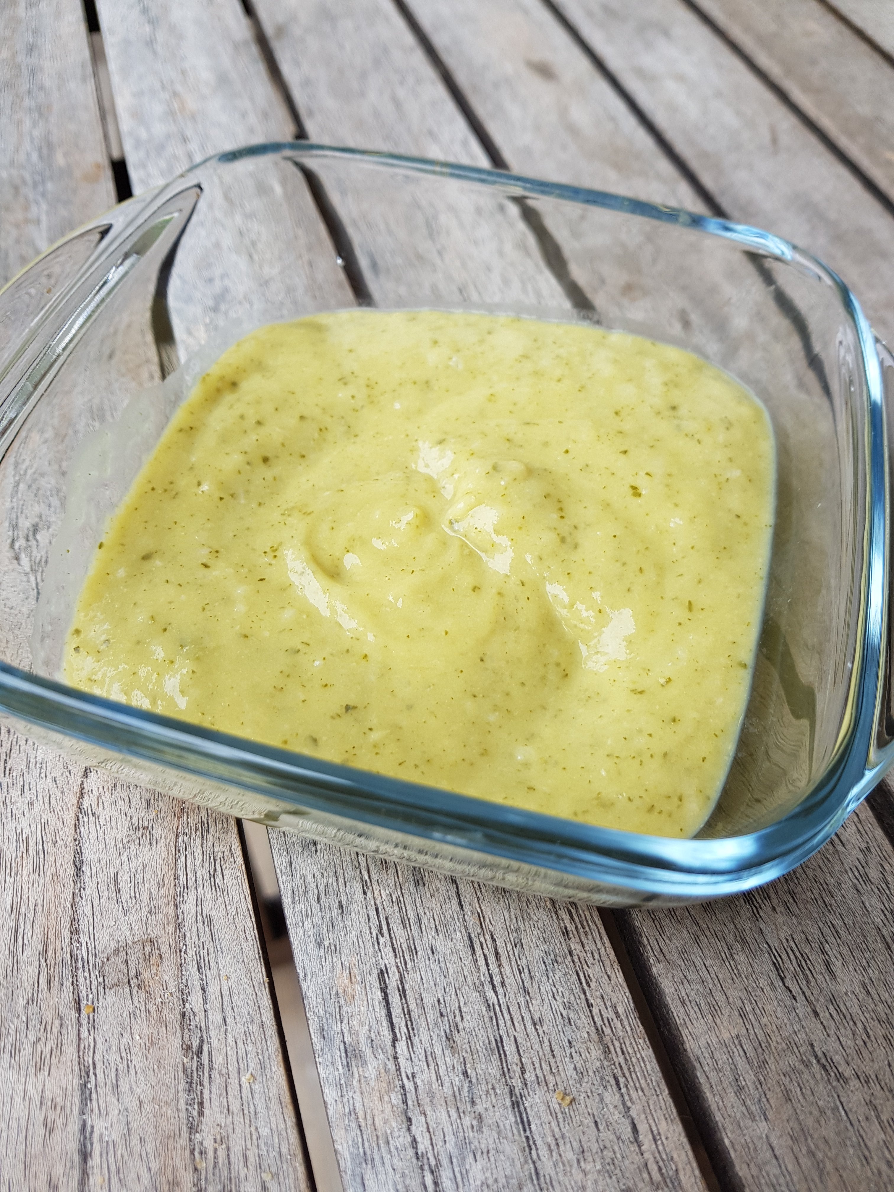 1/2 courgette (cuite au vitaliseur), 1/4 d’oeuf dur, 1 cuillère à soupe de lentilles corail ( cuites au vitaliseur dans un bol : 1 petit verre de lentilles pour 2 petits verres d’eau). Le tout mixé avec un peu d’eau et une cuillère à café d’huile de colza.