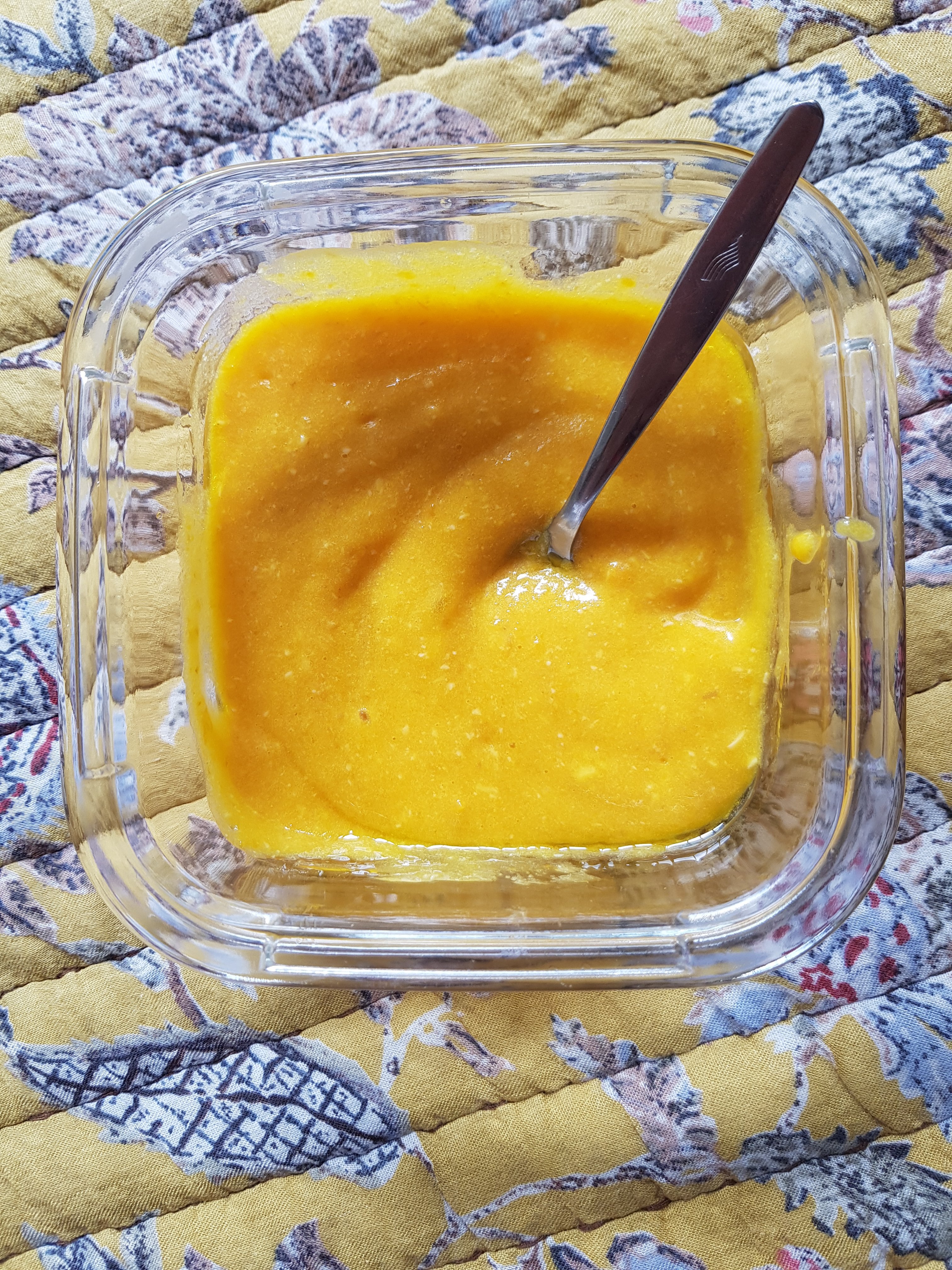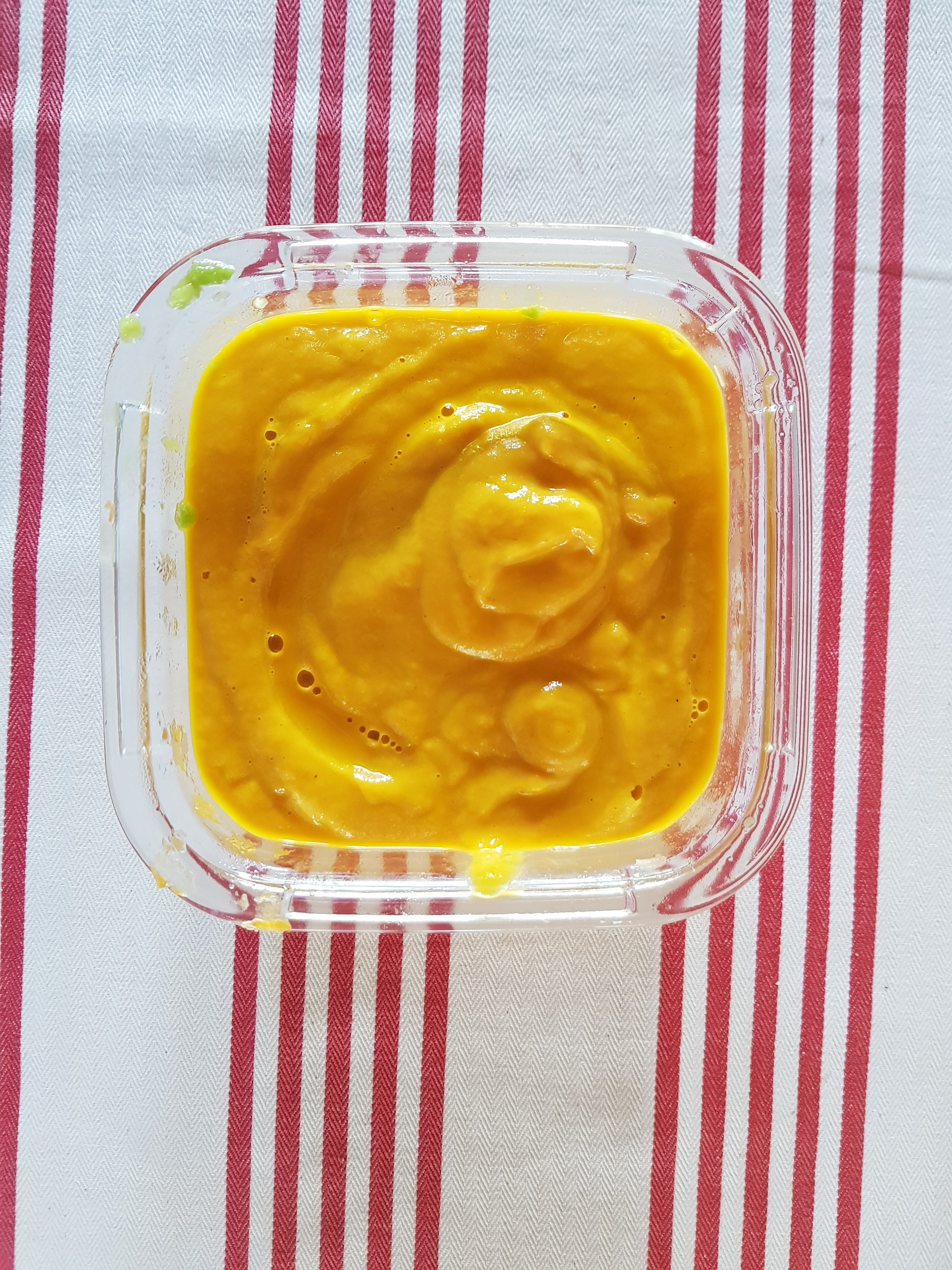 Morceaux de courge cuits au vitaliseur et 1 cuillère à soupe de coquillettes cuites al dente mixés avec 1 cuillère à café de beurre et un peu d’eau pour l’onctuosité