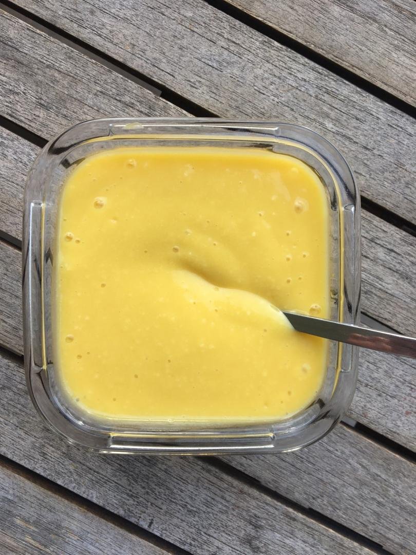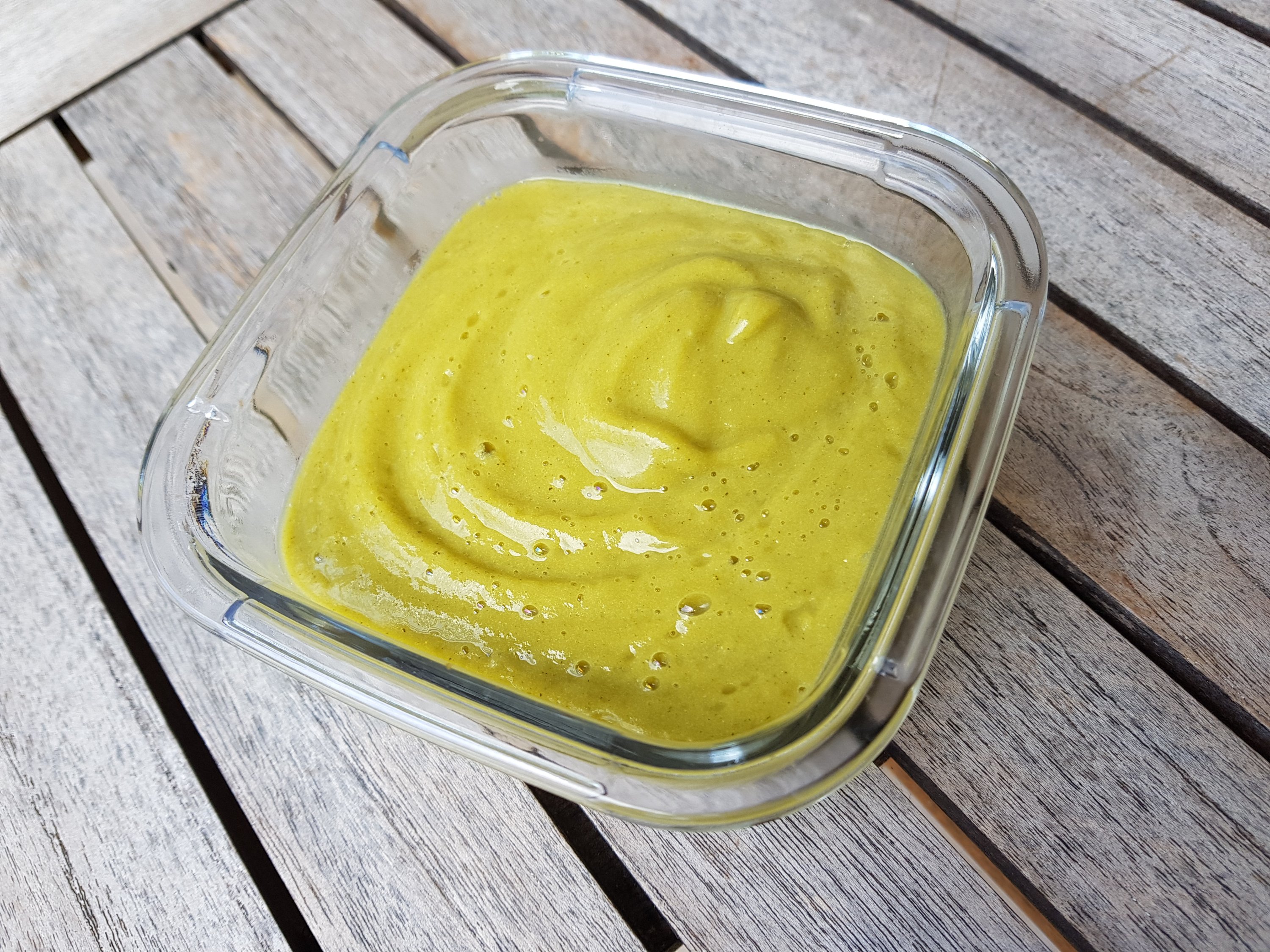 Quelques morceaux d’ananas et 1/2 banane cuits au vitaliseur puis mixés avec ajout d’un soupçon d’eau si besoin.