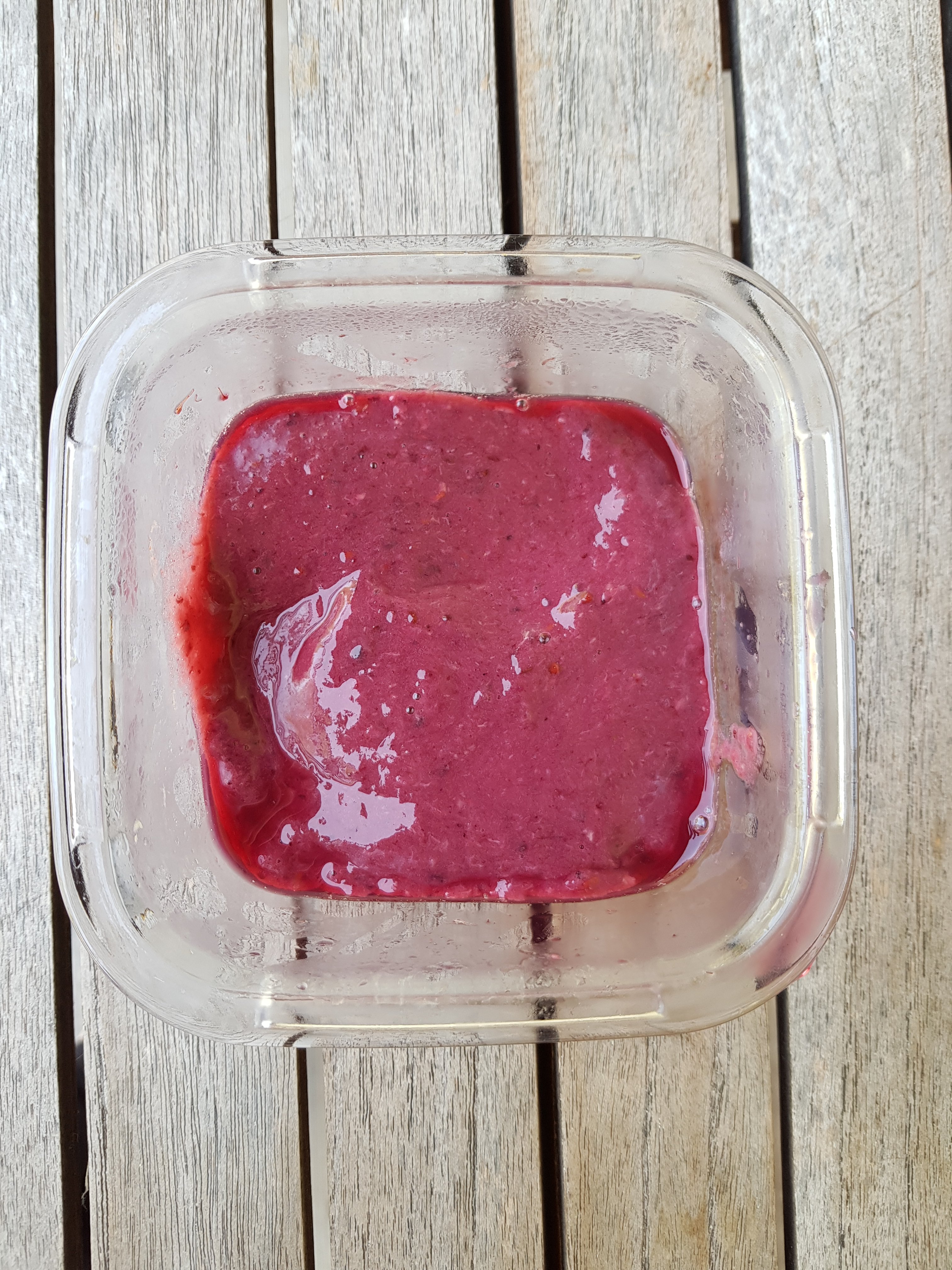 Fruits rouges surgelés et une banane cuits au vitaliseur et mixés.
