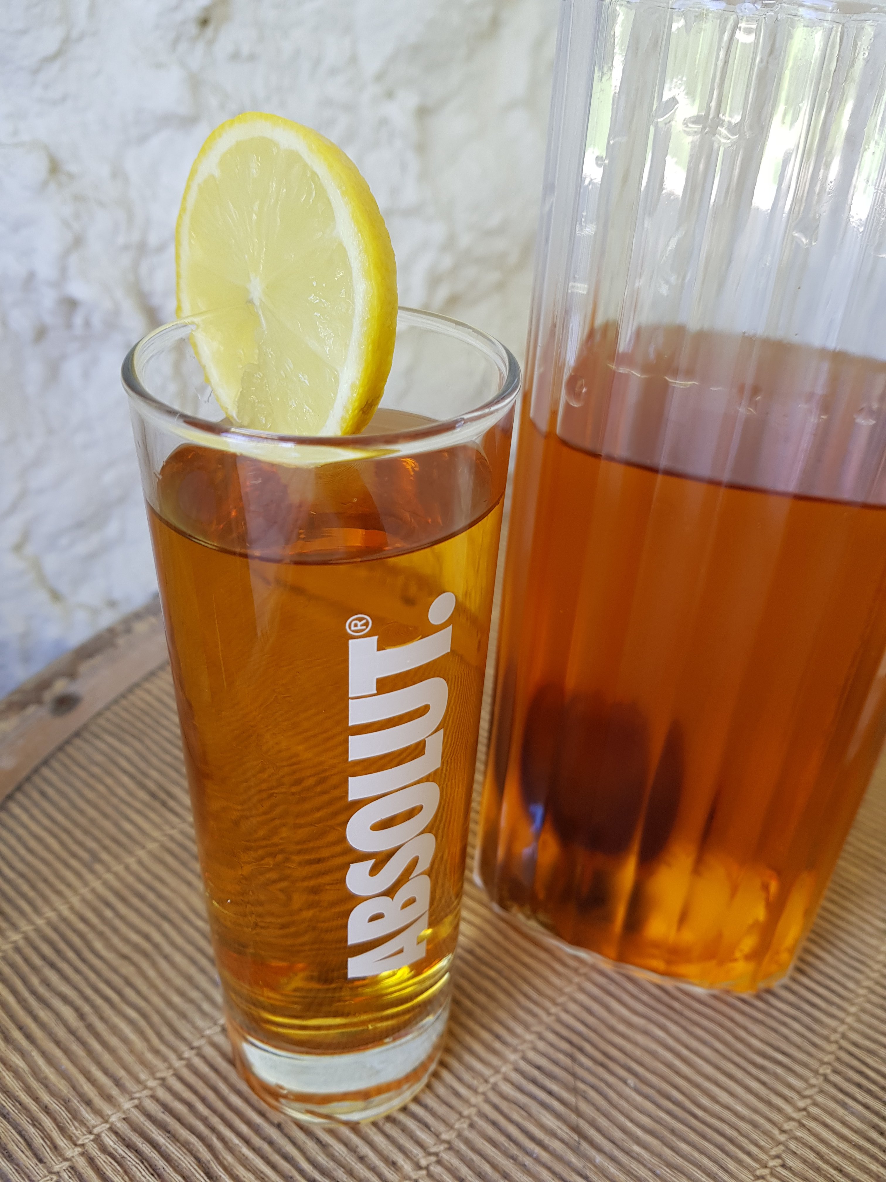 Remplissez une boule à thé de rooibos ( ici, en vrac), remplissez le pichet d’eau à température ambiante et réservez au réfrigérateur pour quelques heures. Goûtez de temps en temps et ajoutez jus de citron, sucre… Amusez-vous!