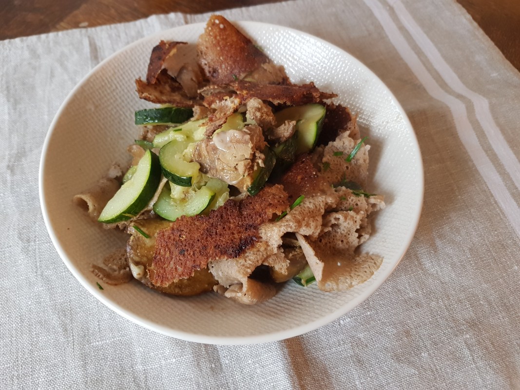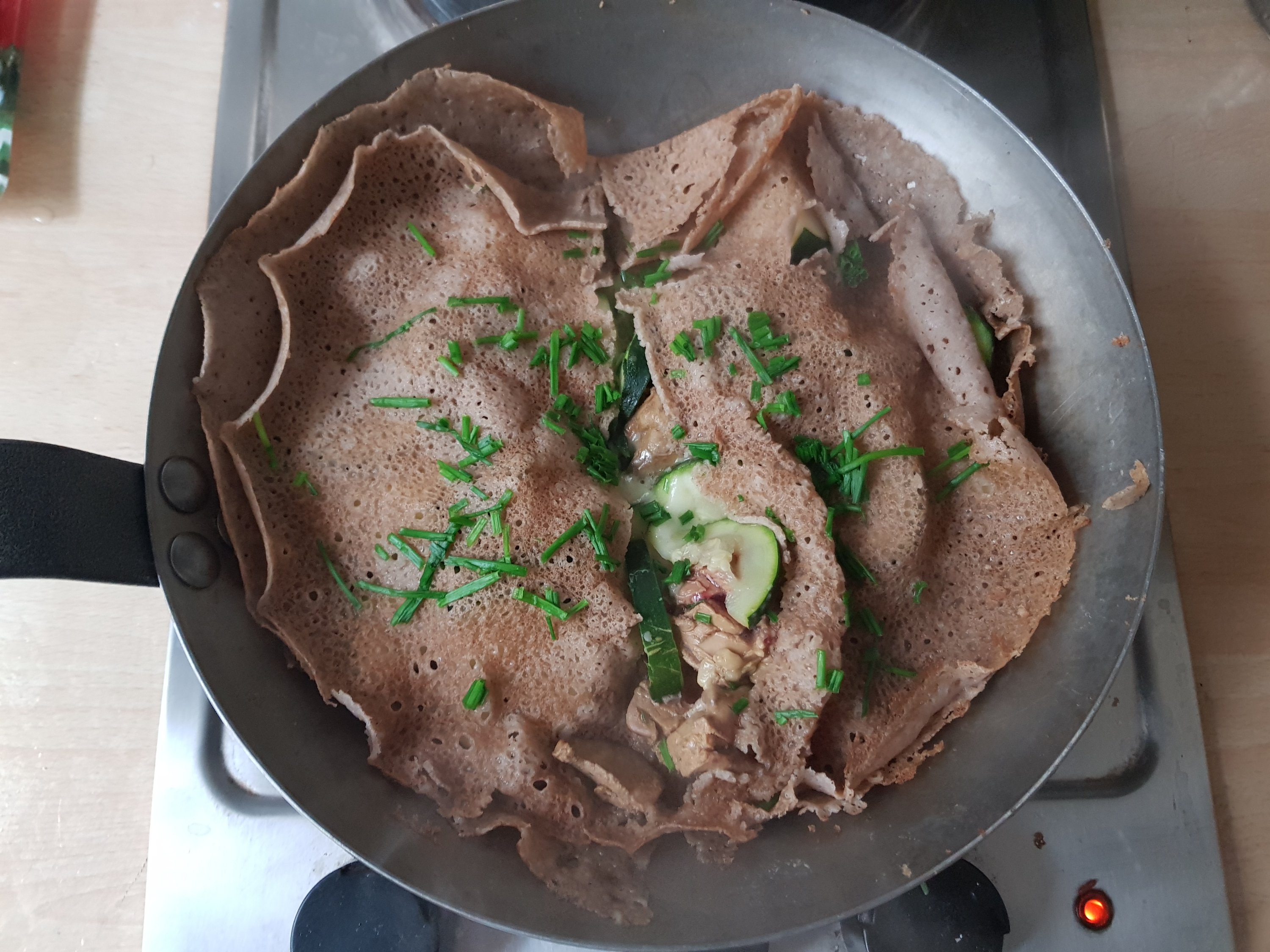 Dans une poêle déposez le beurre puis une galette. Déposez des morceaux de comté puis une fois les morceaux de courgette et foies de poulet cuits ajoutez-les. Couvrez d’une seconde galette de sarrasin et baissez le feu puis patientez jusqu’à ce que cette 2nde galette cuise peu à peu.
