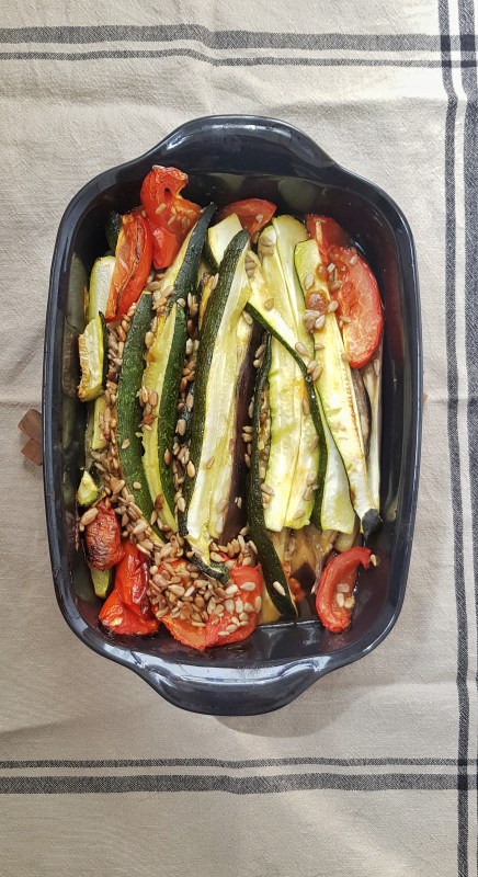 Lavez et découpez aubergine et courgettes en 6 à peu près. Découpez les tomates en 4. Ajoutez l’huile d’olive et les graines de tournesol. Émiettez le cube de bouillon. ( Ou quelques cuillères de bouillon maison, encore mieux!:)