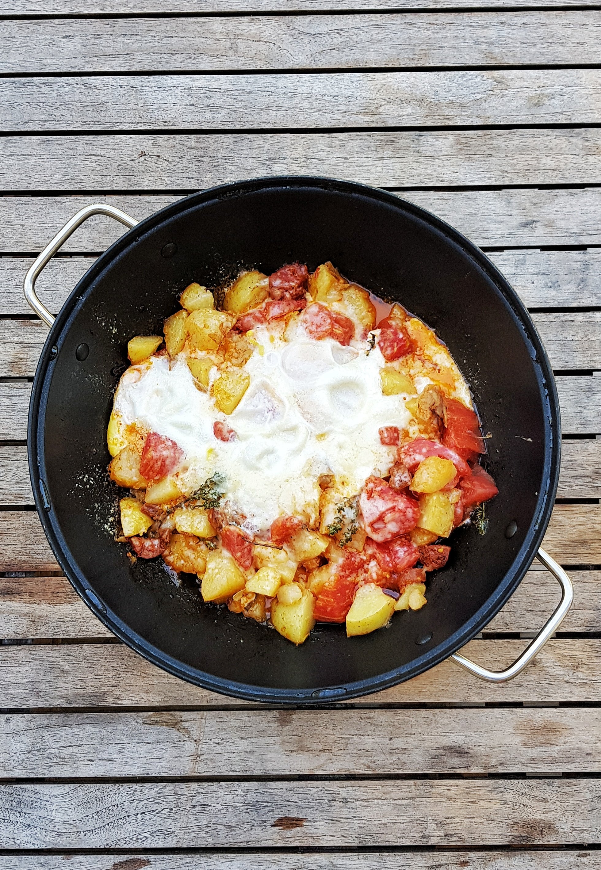 Lancez ensuite le wok avec l’huile d’olive et faites-y revenir à feu fort vos pommes de terre cuites al dente. Une fois bien dorées ajoutez les tomates, le romarin et le chorizo. En dernier lieu vous y casserez vos oeufs ( vous laverez bien les mains… pour une salmonelose en moins:), verserez le parmesan et couvrirez le wok de son couvercle et laisserez mijoter à feu doux le temps que le blanc des oeufs coagule.