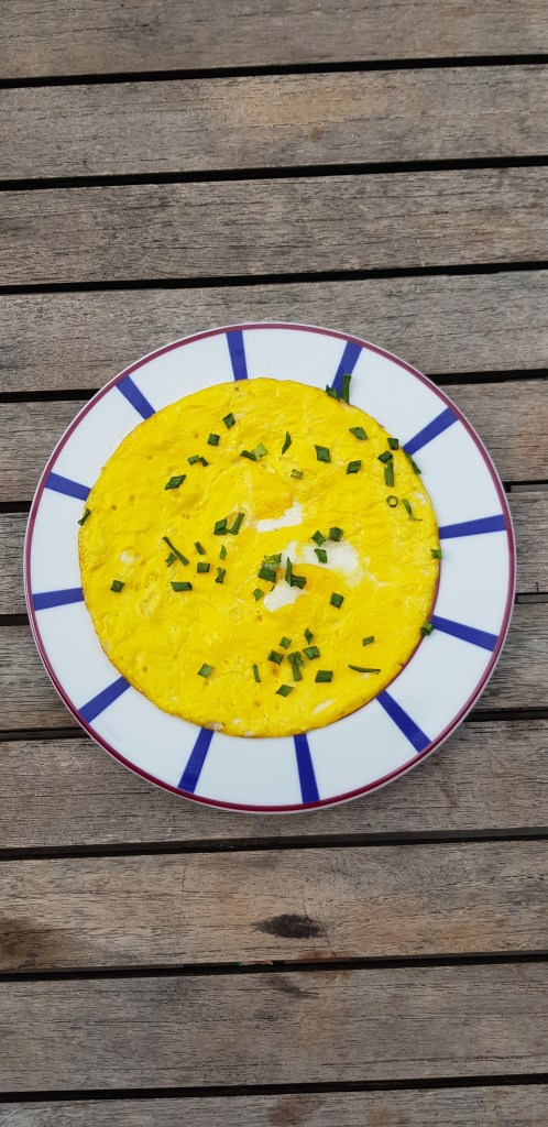 Battre les 3 jaunes d’oeuf, les verser dans une poêle anti-adhésive, ajoutez une pincée de ciboulette ciselée ou en version sucrée, battez-les avec un soupçon de sucre et de vanille. Patientez sur feu très doux, en quelques minutes à peine, votre « omelette » zéro gaspi sera ready! Photo à l’appui :