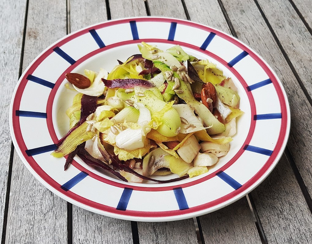 1 courgette, 2 carottes, 2 endives, 1 citron, 2 ( voire davantage) cuillères à soupe d’huile d’olive, une poignée d’amandes et de graines de tournesol.