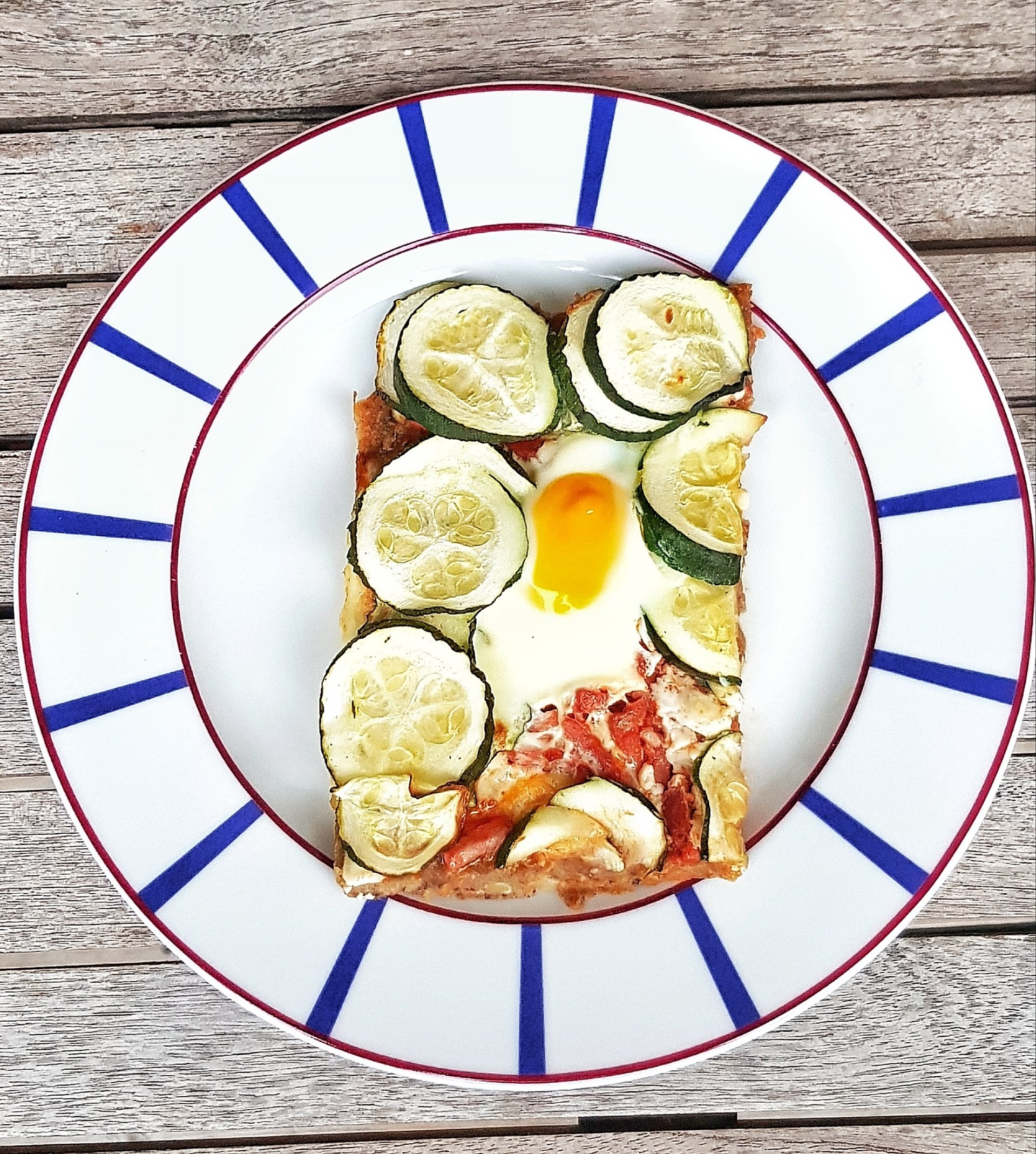 Sortez la pâte du four et installez la garniture en commençant par la sauce tomate étalée de manière homogène puis les lardons, le chorizo, et la courgette et cuisez pour 15 minutes. Pour un jaune d’oeuf coulant aux alentours des 10 minutes de cuisson vous ajouterez vos 4 oeufs sur la pizza et enfournerez pour les 5 minutes restantes ( vérifiez que le blanc ait bien coagulé ( soit bien blanc et ferme et plus translucide).