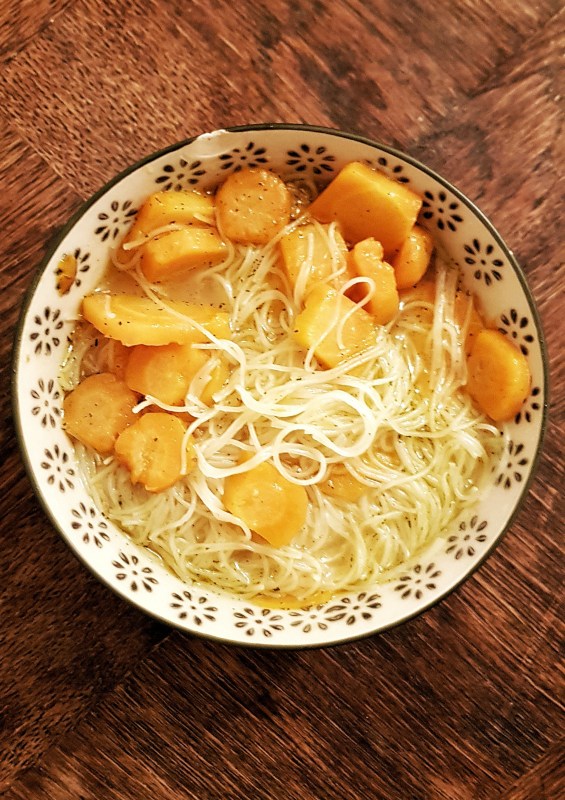 Ingrédients : 1 carotte, 1 portion de vermicelles de riz, 1 bouillon de légumes, 1 soupçon d’huile d’olive.