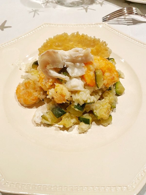 7-une fois le riz cuit, ajoutez dans la poêle à fond épais les crevettes, les courgettes, et le cabillaud, remuez et couvrez quelques minutes. Dressez à l’assiette avec les tuiles de parmesan, salez, poivrez et le tour est joué!