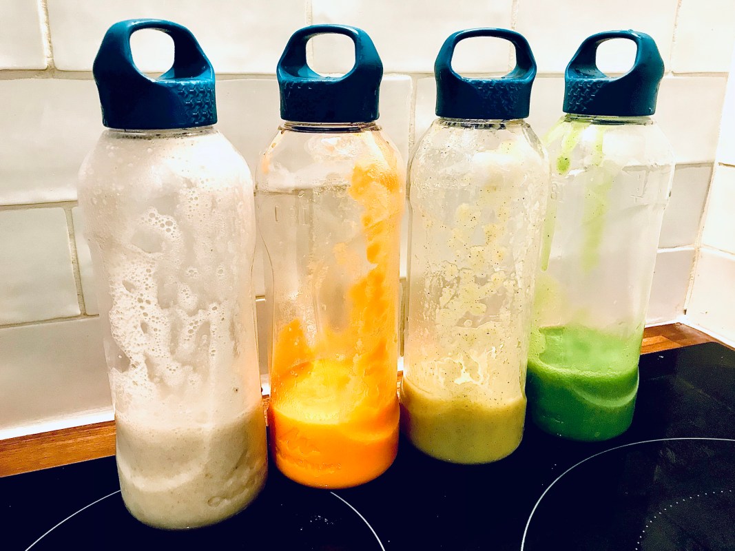 1-Smoothie banane : 1/2 banane, un fond d’eau, 2 cuillères à café de purée d’amandes blanches