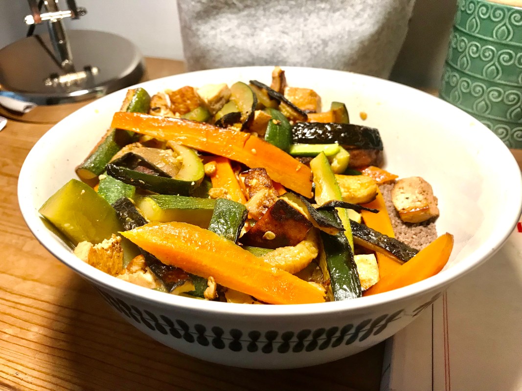 Une fois dorés réservez au chaud et faites dorer de même les courgettes et le tofu.