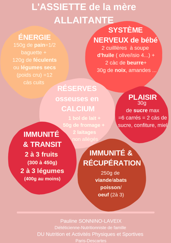 Même si mon rôle consisterait à vous faire part de l’alimentation maternelle parfaite, calculée au cordeau agrémentée de chiffres ( ex : 170mg de vitamine C au lieu de 155mg du aux pertes dans le lait maternel… etc…). Je crois que le simple fait de manger de manière variée et équilibrée lorsqu’on a le temps de se faire un petit frichti entre 2 tétées est déjà, en soi, un exploit !