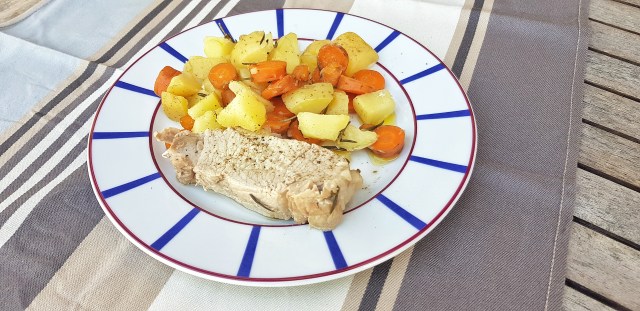 Rôti de porc et petits légumes vapeur au romarin