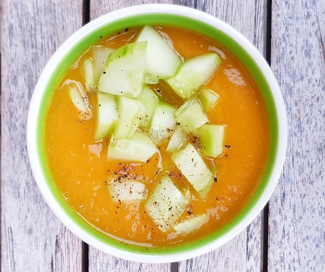 Velouté glacé courgettes, patate douce, dés de concombre